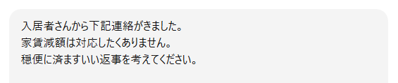 自分なら、つい言い訳したり議論で言い負かしたりしたくなる。しかしそこはグッと我慢だ。入居者と言い争ってもいいことはない。相手に共感して相手の怒りが収まって、毎月ちゃんと家賃がもらえれば僕はそれでよい。チクっと嫌なことを言われても、毎月家賃が入ってくれば問題ない。