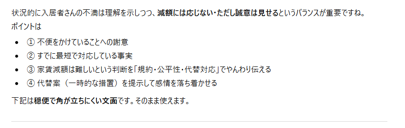 料理ができない・浴槽に浸かれないので、直るまで家賃免除してほしいと連絡をもらった。3口コンロのうち2つは使えるし、お湯はちゃんと出る。追い焚きしなければ浴槽も浸かれる。