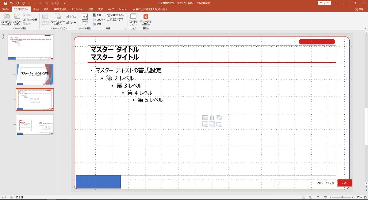 ③のフォーマット作りには結局10時間くらい使った。色んな企業HPを調べてデザインをパクった(オマージュした)。「表示」タブの「スライドマスター」という機能がとても便利だった。自社の標準パワポが完成した。